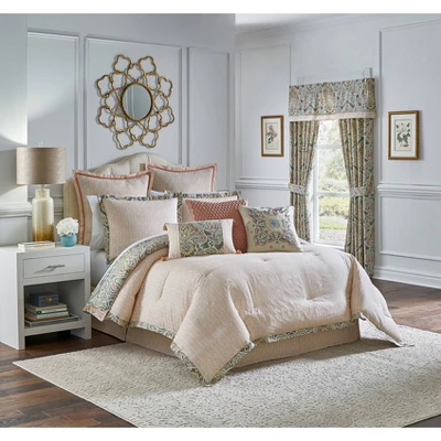 Bring your bedroom to life with the Waverly Artisanal 4pc Bedding Collection. This beautiful ensemble features a dreamy damask print in earth tone shades with hints of teal, gold and coral on a gray ground. Reverse features a coral diagonal stripe print on a tan ground. The double flanged perimeter adds luxurious style to the ensemble. Queen comforter set features a 92″ x 96″ reversible comforter, two 21″ x 26″ reversible standard shams, and a 60″ x 80″ tailored bed skirt with 15″ drop. King comforter set includes a 110″ x 96″ reversible comforter, two 21″ x 36″ reversible king shams, and a 78″ x 80″ tailored bed skirt with 15″ drop. The comforter, shams and bed skirt are machine washable for easy care. Complete your designer look by layering on coordinating accent pillows and lined window treatments, all sold separately.
