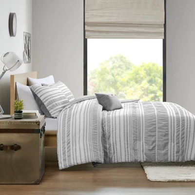 The Intelligent Design Cameron Striped Duvet Cover Set offers a chic casual comfort to your bedroom. This duvet cover features a modern stripe pattern that has a ruched and yarn-dyed look to create dimension, for a contemporary look. Duvet Cover yarn-dye look cationic dyed fabric on face, solid microfiber reverse. Duvet cover with button closure and 4 corner ties.