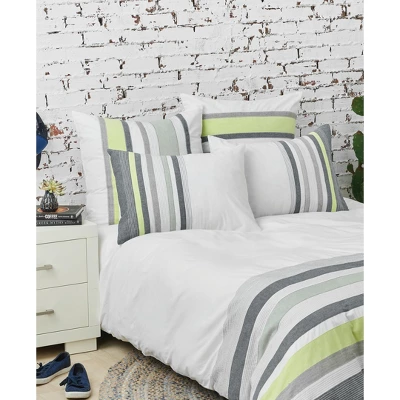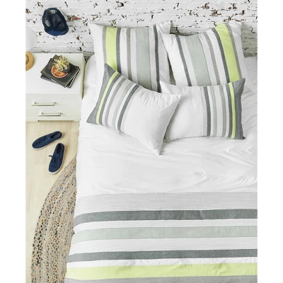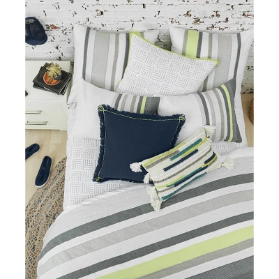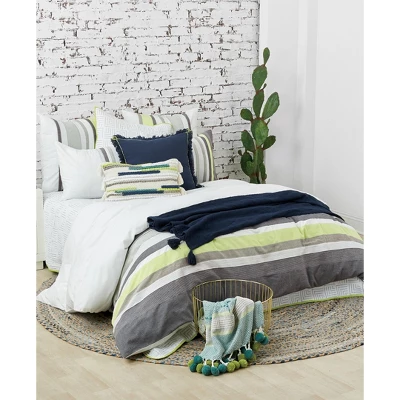 The boulder and indigo stripe design on this 100% cotton duvet cover gives any bedroom a cool and modern feel. With a vibrant citron green accent stripe, the Jones duvet cover brings trending color to the look while still maintaining a relaxed vibe. Finished with a hidden button closure and interior ties.
