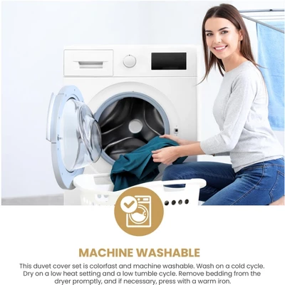 - CARE: Machine washable. Please follow the instructions on the care label in order to minimize wrinkling and/or shrinking. Remove bedding from the dryer promptly, press with a warm iron if necessary