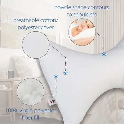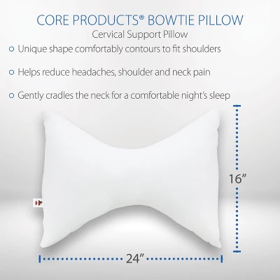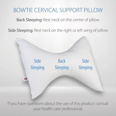 The Bowtie Pillow gently cradles the neck to help reduce tension, headaches, and neck pain. With its unique shape and soft fiber fill, the bowtie pillow provides even support across the shoulder line for tension-free neck support and comfort for a restful night’s sleep. Helps prevent twisting and turning of the neck while sleeping or resting on your side or back. Side bows provide comfortable neck support when sleeping on your side. Either way, the bowtie pillow helps you rest comfortably with its simple and unique design. Made in USA and contains no latex.