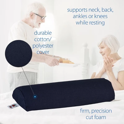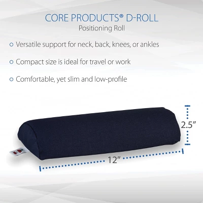 Use the D-Roll to comfortably supports neck, back, ankles or knees while resting. The slim, compact size and versatility of this roll is ideal for home, work, travel, or while recuperating from an injury. This ergonomic roll reduces pressure on various body parts to help relieve pain. Use under neck to help maintain natural cervical curve when lying on your back. Use behind the back when sitting or lying down to help reduce stress on the spine while supporting the natural curve of the lower back. Use to elevate knees and help reduce pressure on hips and low back when lying down. Use under ankles to help reduce pressure and ease pain on back of heels. The flat surface of the d-shape helps keep the roll in place. Designed with precision cut foam and covered with a durable cotton/polyester fabric. Made in USA and contains no latex.