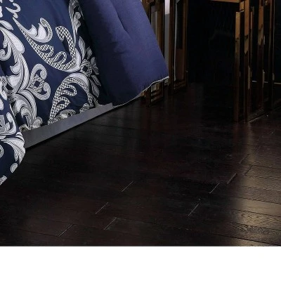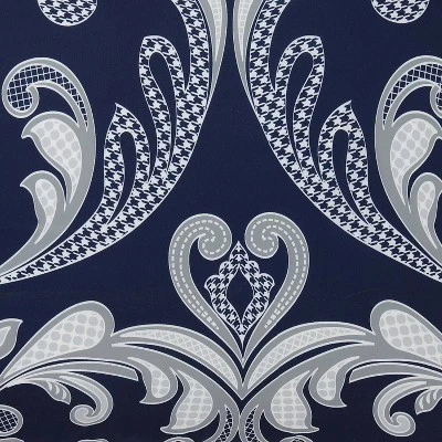 This traditional scroll pattern is dominated by a navy blue background with the large scale repeating scroll pattern in silver and white shades on the face of the comforter. The ensemble is a ten piece set with bed skirt and decorative pillows and shams which completed the whole bed. Face fabrics are 100% microfiber polyester and filled items use 100% polyester fiber filling. The pillow shams use the print from the comforter face, while the European shams use a solid silver color. The decorative pillows use alternative prints that coordinate to the top of the bed with a quilted round pillow, embroidered breakfast pillow and two square pillows. Care and Cleaning: Machine Wash & Tumble Dry, Textile Material: 100% Polyester, Fill Material: 100% Polyester, Fabric Name: Woven, Piece 1: Comforter: 90 Inches (L) x 90 Inches (W), Quantity 1, Number of Pieces: 10, Thread Count: 180, Style: Comforter Bedding Sets, Fabric Weight Type: Year Round Fabric Construction, Backing Material: 100% Polyester, Closure Type: Not Applicable, Includes: 2 Euro Shams, Bed Skirt, Comforter, 2 Shams, 4 Decorative Pillows, Piece 2: Pillow Case: 20 Inches (L) x 26 Inches (W), Quantity 2
