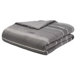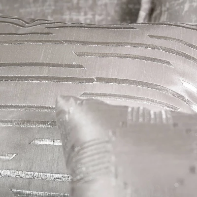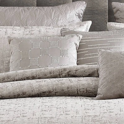 The Genoa 9 or 10 pc bedding ensemble represents the best of today’s contemporary styling. This versatile ensemble features a jacquard print in a sophisticated muted silver hue. Decorative pillows and shams coordinate with the comforter for everything you’ll need to create the perfect room. Create your perfect space from contemporary to traditional with this beautiful and timeless bedding ensemble.
