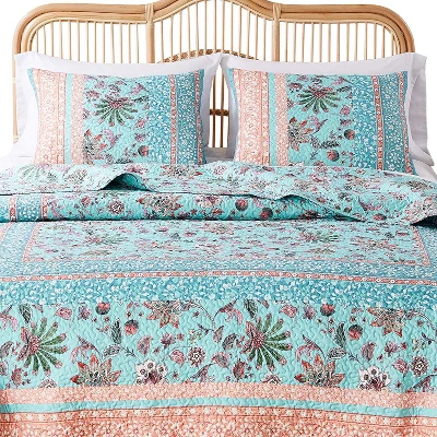 Add a vibrant touch of global flair to your bedroom with the Audrey Quilted Pillow Sham, featuring exotic jacobean ferns and stylized floral motifs in rich turquoise and coral tones. This sham captures a tropical boho vibe while maintaining comfort and durability for everyday use.Key Features