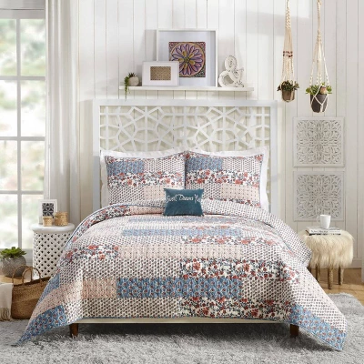 Jessica Simpson has designed new pillow shams, that match the Tallulah quilt, and have a global vibe in shades of denim blues and burnt orange hues. Distressed florals with a block-stamped effect are pieced in a long brick quilting pattern. These pretty floral pillow shams add the allure of distant lands to any bedroom. Made of 100% cotton.