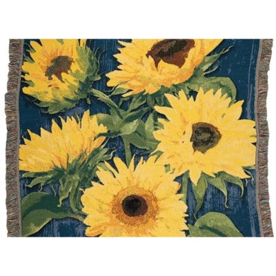 Brighten your space with the Manual Woodworkers Zig Zag Sunflowers Blue Tapestry Throw, a 50 x 60-inch woven cotton blanket that blends vibrant floral charm with cozy comfort. This tapestry features bold sunflower motifs arranged in an eye-catching zigzag pattern, accented by cool blue tones for a fresh country-inspired look. Expertly jacquard-woven in the USA, it offers a dimensional texture and detailed finish, perfect for use as a decorative throw, sofa accent, or wall hanging. Its generous size makes it both functional and visually impactful in living rooms, bedrooms, or farmhouse-style spaces.