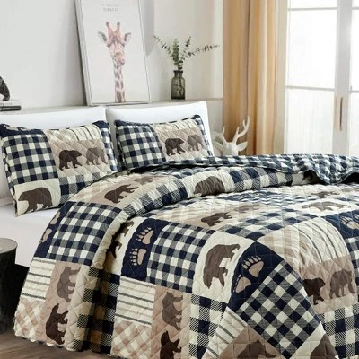 Add a rustic, modern flair to your home with this beautiful Orson Collection Reversible Lodge Quilt Set by Market & Place. Crafted with a soft and breathable microfiber exterior and cotton/polyester fill, this quilt set keeps you cozy and comfortable all year long. It’s charming cabin themed buffalo check design with bears is the perfect accent to layer on top of your bed. This quilt set is machine washable for easy care and long lasting use. Each quilt set comes with one quilt and two shams (one sham for Twin size). Choose from three sizes: Twin: 1 Quilt (90″ x 66″), 1 Standard Sham (20″ x 26″), Queen: 1 Quilt (90″ x 90″), 2 Standard Shams (20″ x 26″), King: 1 Quilt (90″ x 108″), 2 King Shams (20″ x 36″)