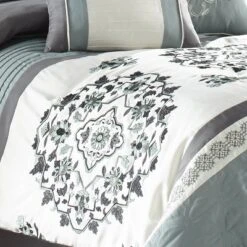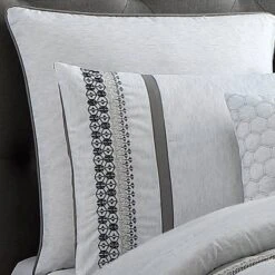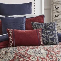 Update and refresh your bedroom with the Sadler 9/10 piece comforter set from Riverbrook Home. The elegant red and gray pattern and embroidered details add dimension and style and complement any decor style. Set includes one comforter, one bed skirt, three decorative pillows, two euro shams (three with king size) and two shams. Machine washable for easy care and maintenance